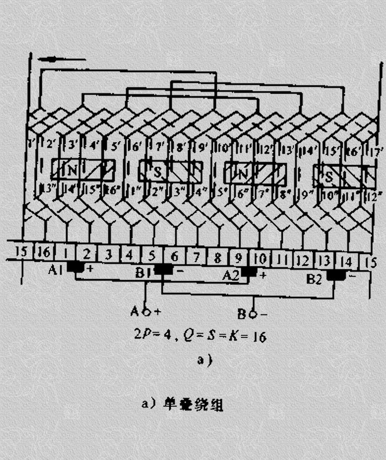這個繞組聯接的特點是先串聯所有N極下的上層元件邊和S極下的下層元件邊,組成一條支路,然后串聯所有S極下的上層元件邊和N極下的下層元件邊,又組成了另一條支路。因此只有兩條支路。
