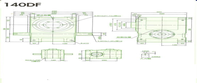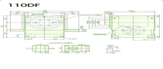此系列機種之尺寸設計特性與凸緣型弁酮萓A於驅動運轉上可承受超大軸向負載及垂直徑向壓力,在輸出端有一凸起固定盤面及大孔徑空心軸,可搭配設置動態、靜態自動化周邊設備,可將動力源之電、油、氣管路置於空心孔內,此系列機種廣泛應用於重負載、直結自動化設備之各類機構及產業機械,作同步自動化間歇驅動。技術參數項目符號單位數值出力軸容陵|向負荷C1kgf520出力軸容雀b向負荷C2kgf220出力軸容酗O矩Tskgf-m參考力矩表入力軸容陵|向負荷C3kgf220入力軸最大彎曲力矩C4kgf160入力軸最大扭矩C5kgf-m 9.5入力軸的GD2(注1)C6kgf-m20.03定位分割精度sec.30重量kg20注1:入力軸的GD2是在停留範圍內的數值。注2:C1至C5數值是達到安全系數=2時的數值。