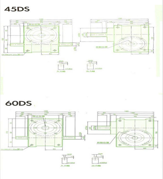 心軸型凸輪間歇分割器:此系列機種為典型傳統心軸造型,其安裝配件之加工安裝配合齒輪、聯軸或聯軸盤,需特別注意孔徑公差(+0.015/-0)及鍵槽公差(+0.015/-0),其使用場合在輸送帶驅動、齒輪驅動、無間隙聯軸器結合驅動居多。 心軸型凸輪間歇分割器的規格型號有:心軸型45DS,心軸型60DS,心軸型70DS,心軸型80DS,心軸型83DS心軸型, 100DS,心軸型110DS心軸型,125DS心軸型,140DS心軸型150DS,心軸型180DS,心軸型200DS