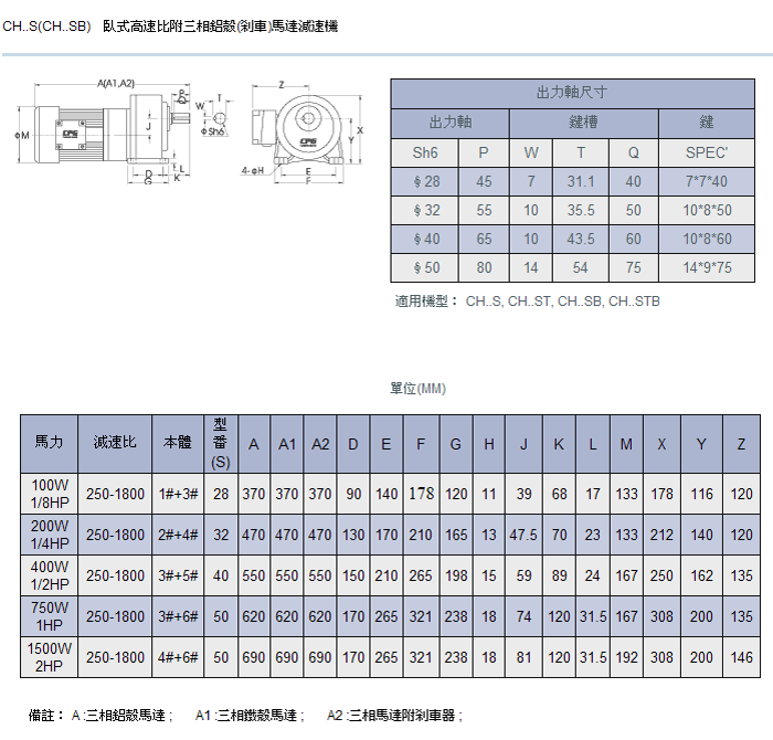 城邦臥式標準/縮框高速比馬達減速機是采用日本三菱的技術設計制造。具有低噪聲,低振動,體積小,重量輕,型號多樣,安裝維護簡單等特點。特性:鋁合金外殼,斜齒輪精密研磨,獨特防水防潮設計、電機 IP55 保護等級、 F 級絕緣、低噪音、長壽命,免維護、現貨供應、服務一流模型代號 TYPES : CH, CV, CHM, CVM, CHD, CVD 馬力 CAPACITY : 100W-3700W減速比RATIO : 3, 5, 10, …1800