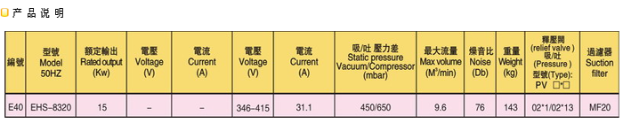 雙段鼓風機EHS8320風機特點:1.超靜音型,無噪音: 采用德國先進技術,馬達直接運轉,在通過加上一體式的銷音設施,改進了高壓風機噪音大的現像,從而達到靜音的效果。 2.可靠性高當使用情況變化時,機器仍可安全運轉。除了葉輪之外,高壓鼓風機沒有其他動作,因此可靠性之高幾乎免維修。使用獨一無二且散熱良好的精密外側軸承,因此它具有下列優點:高壓縮比;軸承運轉溫度低;潤滑油脂壽命長;免保養。 3.安裝容易 配備齊全,可隨時安裝與使用,供壓縮空氣或用于抽真空,也可任意安裝于水平或垂直的方向。 4.無油無污染 葉輪旋轉時,不與任何部分零件接觸,免潤滑,因此可保證百分之百無污染。 5.最高品質 經過17年的專業制造經驗,最精密機械設計加上慎重電機配合標準儀器測試,使用所有零件均能達到最高品質要求,運用標準ip54,f級馬達效率高,故障極少,馬達與鼓風機之間有軸封分試,預防異物進入。同時為確保功能效果,每一臺鼓風機在出廠前均經過嚴格測試。 6.電壓:萬國電壓型,50HZ 60HZ均可用,無論您的產品是出口至歐美的使用60Hz,高電壓的國家,還是中東,非洲等使用50Hz電壓的國家及地區,此款環保風機均能達到要求,功能產齊全,讓您無后顧之憂! 適用范圍:環保工程 產業機械,塑膠機械(除濕干燥機),印刷機械(絲網印機),照相制版,pcb設備,電器設備,醫療設備,各式燃燒機,鍋,環保養殖業等等